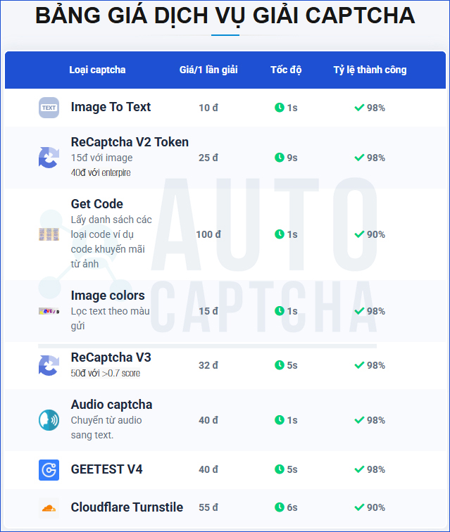 Dưới đây là bảng dịch vụ chính đang được AutoCaptcha.pro cung cấp:
